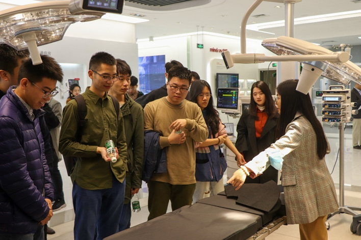 同学们在参观展厅和观看公司宣传片后,与我校校友迈瑞医疗主任工程师李双双就医疗器械产业发展,在校生的职业选择与人生规划进行了座谈交流。