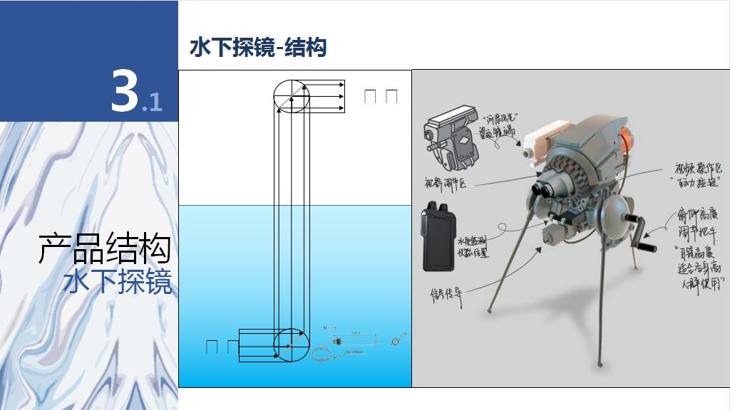 方案描述:通过打造一套生态友好型自然科普交互装置——水下探镜,从儿童视角出发融入智能交互方式,推广下一代的自然科普教育。通过水下传感器,实时监测河流的污染程度并进行记录和预警,结合不同的水质情况配合不同情感的语音合成,进行生态系统演示。