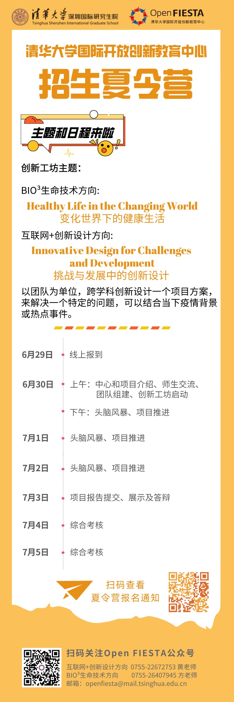 清华大学深圳国际研究生院Open FIESTA中心将于2022年6-7月举办“2022年全国优秀大学生夏令营”和“2023级招生说明会”。活动旨在增进国内高校本科生对中心【BIO³生命技术】和【互联网+创新设计】两个硕士项目的了解,同时为接收2023级免试推荐研究生进行初步遴选工作。正式录取工作将根据清华大学的统一安排在2022年秋季学期开学初进行。