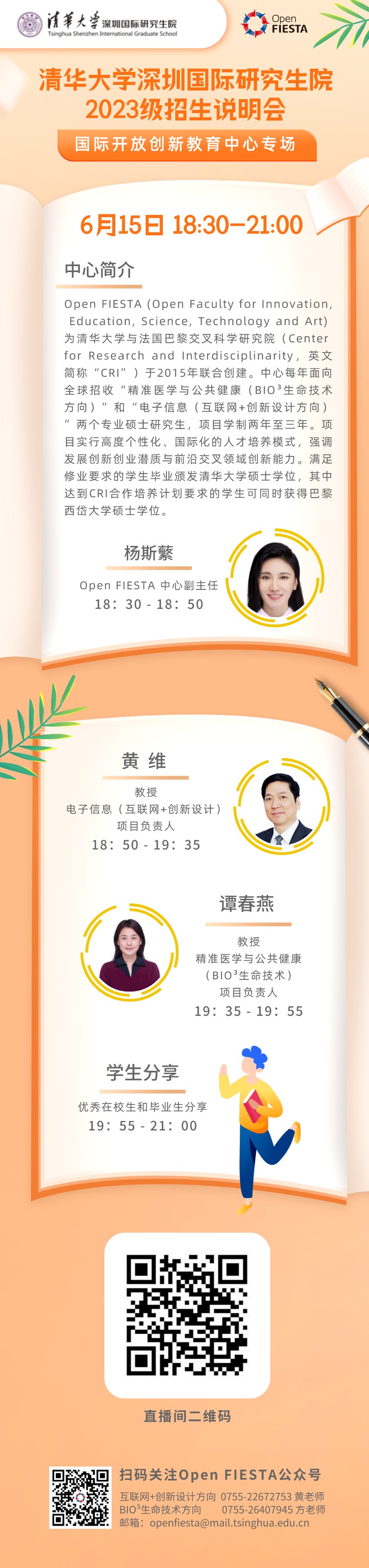 清华大学深圳国际研究生院Open FIESTA中心将于2022年6月15日(周三)晚18:30-21:00举办2023级招生说明会,详情见海报。期待你的到来!