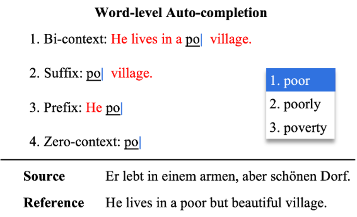 关于实践课题的意义,杨程提到,近些年来,机器翻译虽然能够带来性能的普适提升,并且用于各个落地应用中,但在一些专业文本的翻译(例如法律,医疗和金融等),自动生成的机器翻译结果依旧无法彻底代替人工翻译结果。于是,研究者们思考,机器翻译系统是否可以与人工翻译相结合,辅助人工翻译过程,提高人工翻译的有效性和效率(例如降低译员的打字数),因此计算机辅助翻译得到了越来越多的关注。本次实践旨在解决计算机辅助机器翻译中的词级别自动补全任务(Word-Level Auto-Completion)。具体来说,是翻译场景下的自动补全任务,相比于一般的自动补全任务,其任务特性主要体现在输入端包括三个部分:源语言端句子,译员已翻译的部分目标语言端句子 以及译员输入的字符前缀。