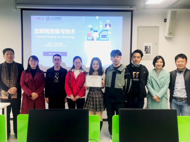 图 | 辜雅婷(左4)与团队在互联网思维与技术课程展示